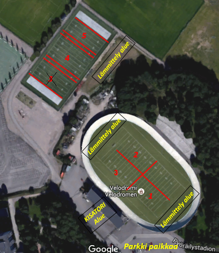 HUOM! Mahdollisen sateen vuoksi sisä-Velodromille on siirretty 3 kenttää ja ulko-Velodromilla pelataan kahdella kentällä.